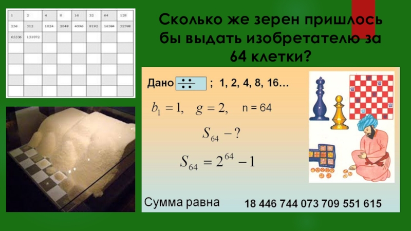 Слайд 14Сколько же зерен пришлось бы выдать изобретателю за 64 клетки?