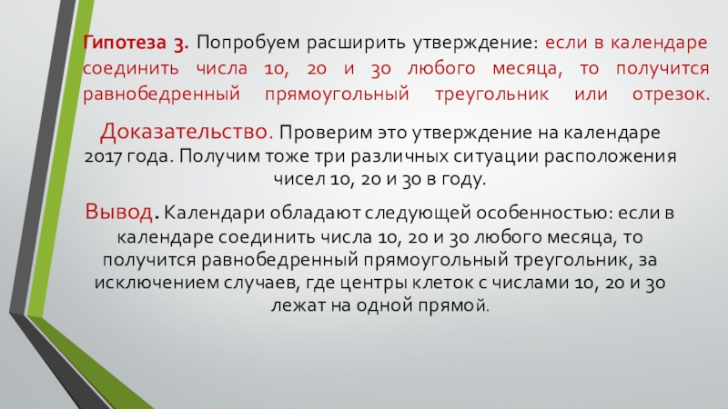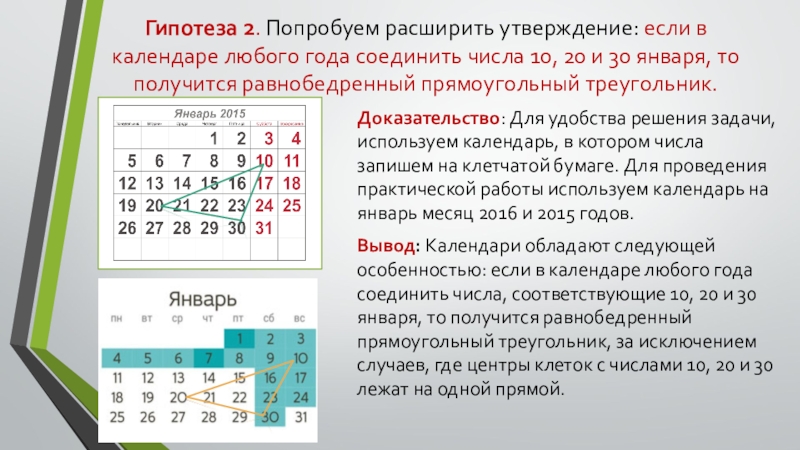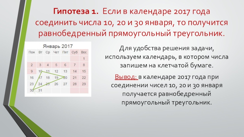 Вывод: в календаре 2017 года при соединении чисел 10, 20 и 30 января получается равнобедренный прямоугольный треугольник.