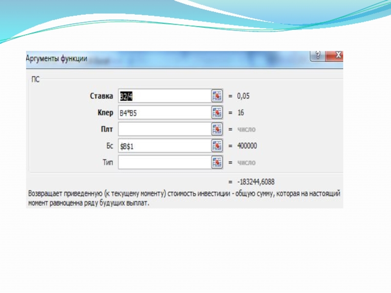 функцию ПС (СТАВКА, КПЕР, ПЛТ, БС, ТИП).