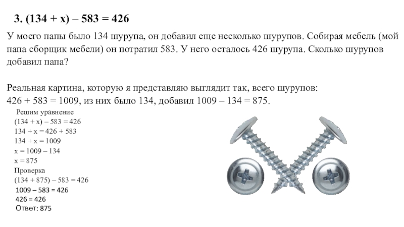 134 шурупа, он добавил еще несколько шурупов. Собирая мебель (мой папа сборщик мебели) он потратил 583. У него осталось 426 шурупа. Сколько шурупов добавил папа?