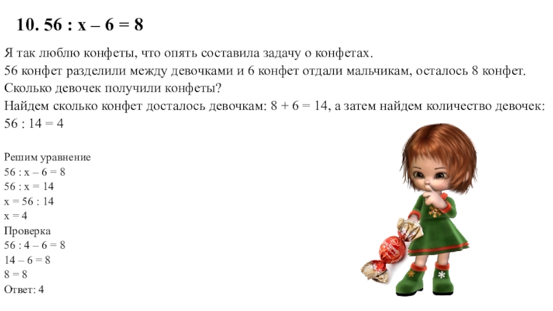56 конфет разделили между девочками и 6 конфет отдали мальчикам, осталось 8 конфет. Сколько девочек получили конфеты?