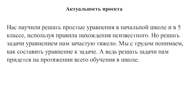 5 классе, используя правила нахождения неизвестного. Но решать задачи уравнением нам зачастую тяжело. Мы с трудом понимаем, как составить уравнение к задаче. А ведь решать задачи нам придется на протяжении всего обучения в школе.