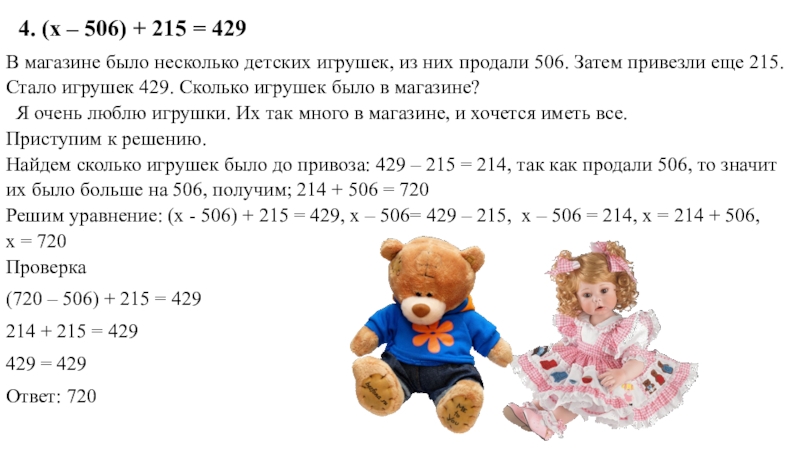 Решим уравнение: (х - 506) + 215 = 429, х – 506= 429 – 215, х – 506 = 214, х = 214 + 506,