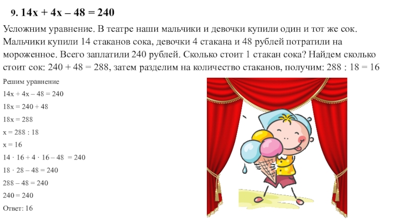 наши мальчики и девочки купили один и тот же сок. Мальчики купили 14 стаканов сока, девочки 4 стакана и 48 рублей потратили на мороженное. Всего заплатили 240 рублей. Сколько стоит 1 стакан сока? Найдем сколько стоит сок: 240 + 48 = 288, затем разделим на количество стаканов, получим: 288 : 18 = 16