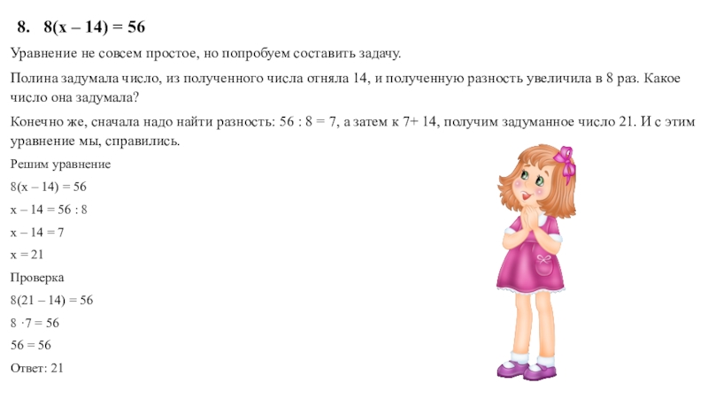Конечно же, сначала надо найти разность: 56 : 8 = 7, а затем к 7+ 14, получим задуманное число 21. И с этим уравнение мы, справились.