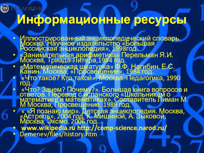 «Что? Зачем? Почему?». Большая книга вопросов и ответов. Перевод с испанского «Школьникам о математике и математиках». Составитель Лиман М.М Москва, Просвещение. 1989 год.