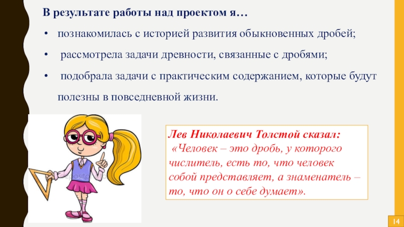 «Человек – это дробь, у которого числитель, есть то, что человек собой представляет, а знаменатель – то, что он о себе думает».