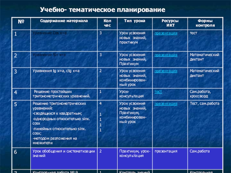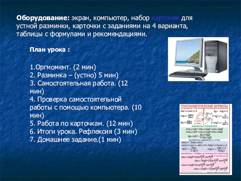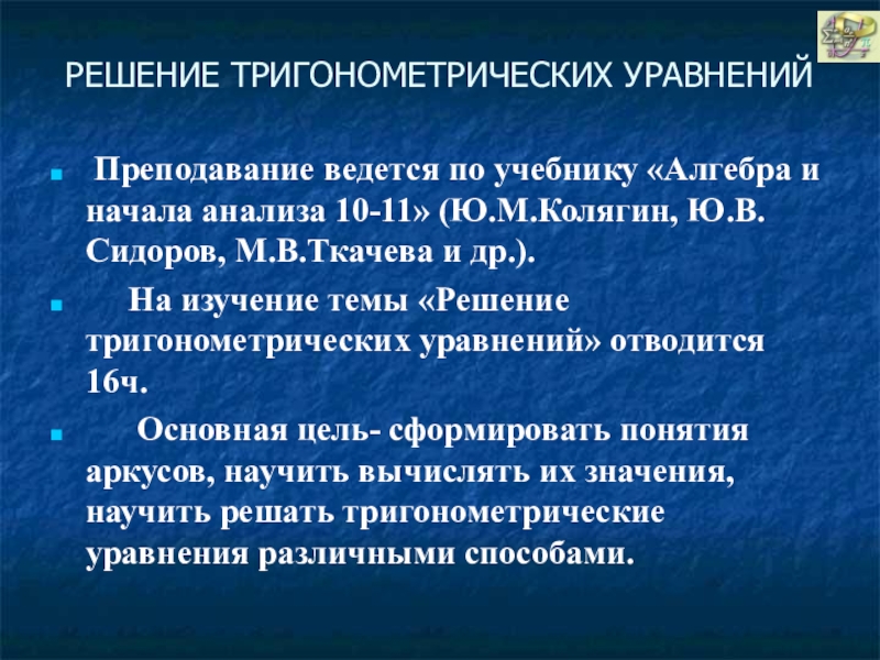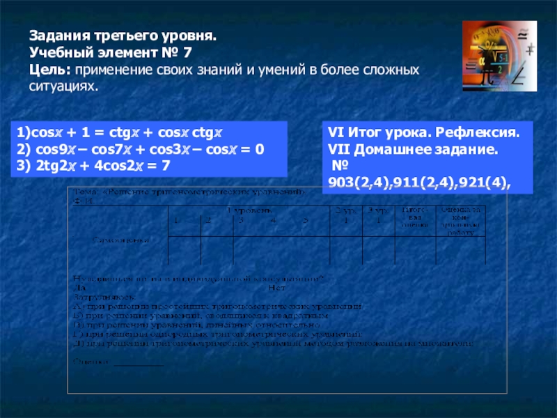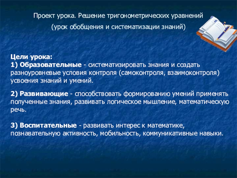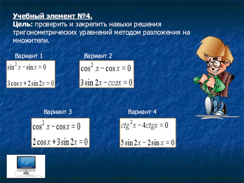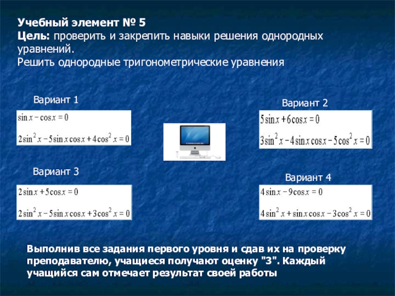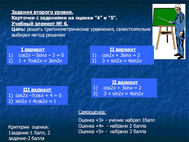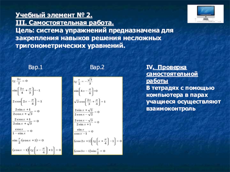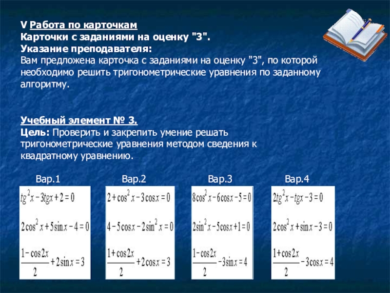 Цель: Проверить и закрепить умение решать тригонометрические уравнения методом сведения к квадратному уравнению.