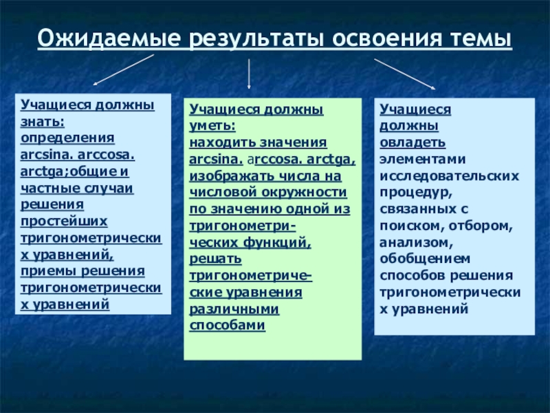находить значения arcsina. аrccosa. аrctga, изображать числа на числовой окружности по значению одной из тригонометри-