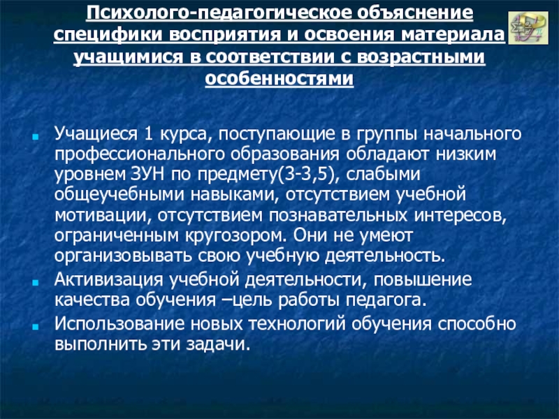 Учащиеся 1 курса, поступающие в группы начального профессионального образования обладают низким уровнем ЗУН по предмету(3-3,5), слабыми общеучебными навыками, отсутствием учебной мотивации, отсутствием познавательных интересов, ограниченным кругозором. Они не умеют организовывать свою учебную деятельность.