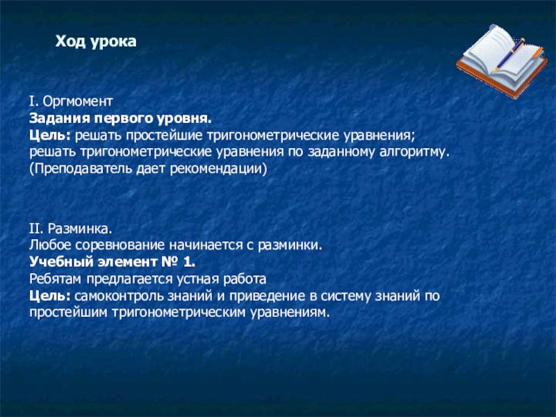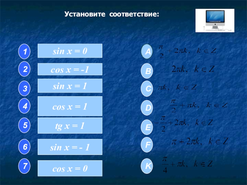 Цель: самоконтроль знаний и приведение в систему знаний по простейшим тригонометрическим уравнениям.