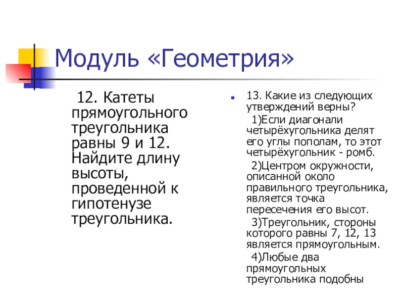 3)Треугольник, стороны которого равны 7, 12, 13 является прямоугольным.