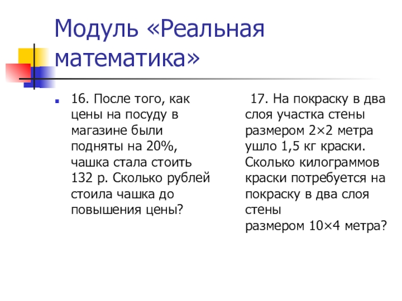 17. На покраску в два слоя участка стены размером 2×2 метра ушло 1,5 кг краски. Сколько килограммов краски потребуется на покраску в два слоя стены размером 10×4 метра?