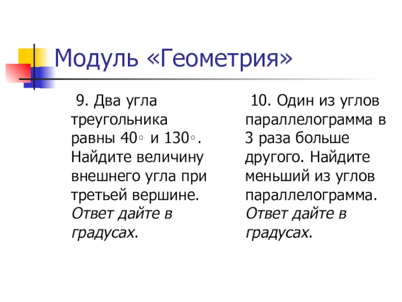 10. Один из углов параллелограмма в 3 раза больше другого. Найдите меньший из углов параллелограмма. Ответ дайте в градусах.
