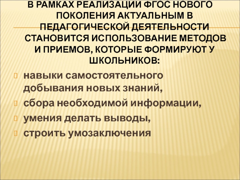 В РАМКАХ РЕАЛИЗАЦИИ ФГОС НОВОГО ПОКОЛЕНИЯ АКТУАЛЬНЫМ В ПЕДАГОГИЧЕСКОЙ ДЕЯТЕЛЬНОСТИ СТАНОВИТСЯ ИСПОЛЬЗОВАНИЕ МЕТОДОВ И ПРИЕМОВ, КОТОРЫЕ ФОРМИРУЮТ У ШКОЛЬНИКОВ: