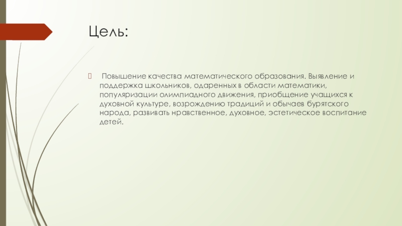 области математики, популяризации олимпиадного движения, приобщение учащихся к духовной культуре, возрождению традиций и обычаев бурятского народа, развивать нравственное, духовное, эстетическое воспитание детей.