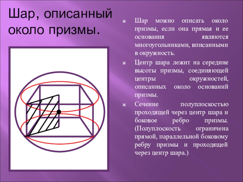 Центр шара лежит на середине высоты призмы, соединяющей центры окружностей, вписанных в основание призмы.
