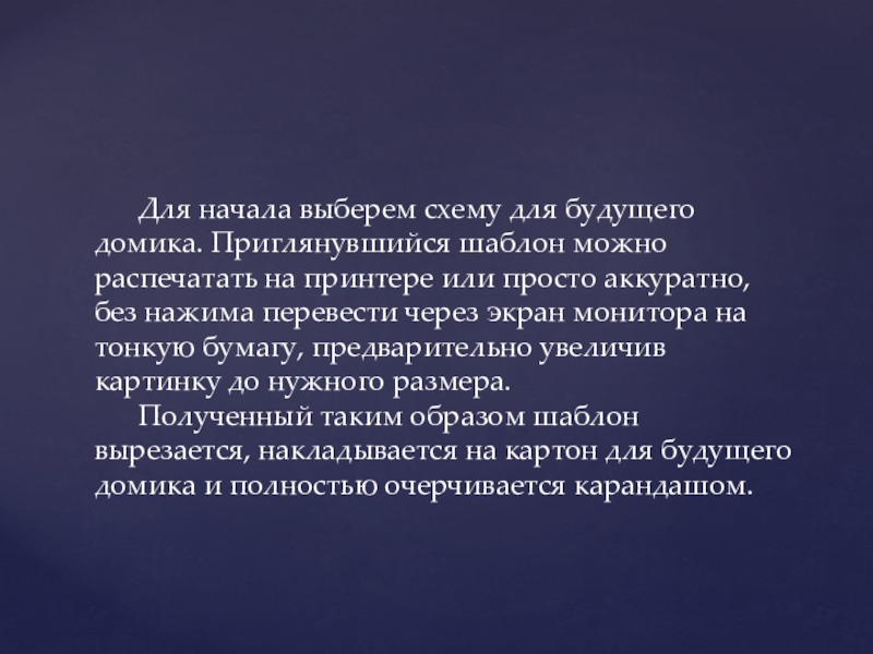 на принтере или просто аккуратно, без нажима перевести через экран монитора на тонкую бумагу, предварительно увеличив картинку до нужного размера. Полученный таким образом шаблон вырезается, накладывается на картон для будущего домика и полностью очерчивается карандашом.