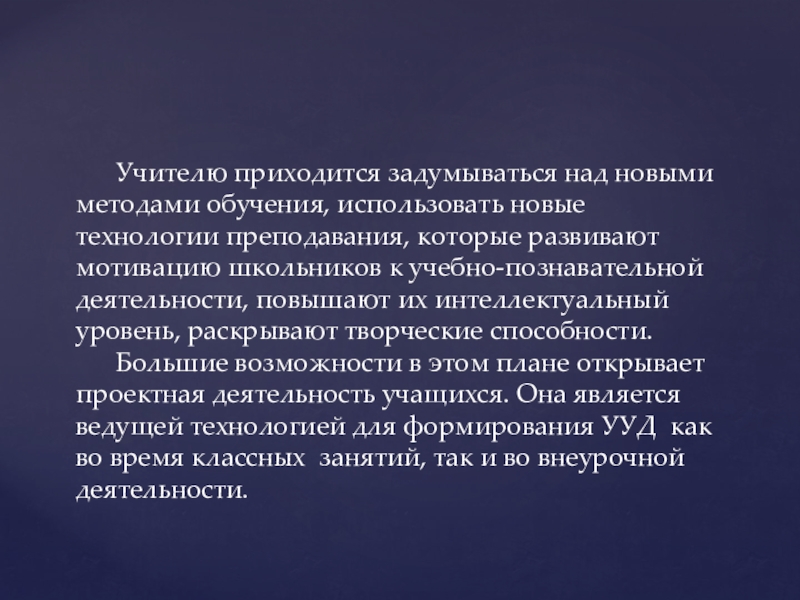 которые развивают мотивацию школьников к учебно-познавательной деятельности, повышают их интеллектуальный уровень, раскрывают творческие способности. Большие возможности в этом плане открывает проектная деятельность учащихся. Она является ведущей технологией для формирования УУД как во время классных занятий, так и во внеурочной деятельности.