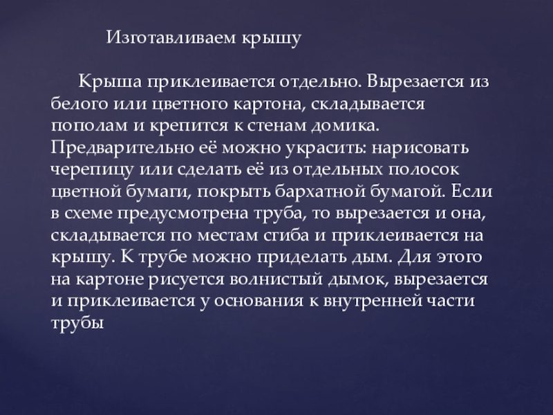 пополам и крепится к стенам домика. Предварительно её можно украсить: нарисовать черепицу или сделать её из отдельных полосок цветной бумаги, покрыть бархатной бумагой. Если в схеме предусмотрена труба, то вырезается и она, складывается по местам сгиба и приклеивается на крышу. К трубе можно приделать дым. Для этого на картоне рисуется волнистый дымок, вырезается и приклеивается у основания к внутренней части трубы