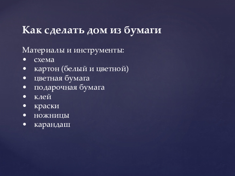 Слайд 5Как сделать дом из бумаги Материалы и инструменты: • схема • картон (белый и цветной) • цветная бумага • подарочная