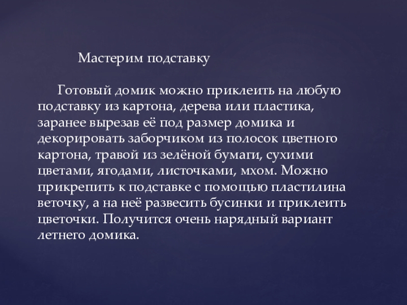Слайд 19 Мастерим подставку Готовый домик можно приклеить на любую подставку из картона, дерева