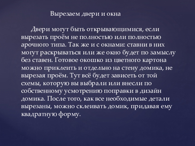 вырезать проём не полностью или полностью арочного типа. Так же и с окнами: ставни в них могут раскрываться или же окно будет по замыслу без ставен. Готовое окошко из цветного картона можно приклеить и отдельно на стену домика, не вырезая проём. Тут всё будет зависеть от той схемы, которую вы выбрали или внесли по собственному усмотрению поправки в дизайн домика. После того, как все необходимые детали вырезаны, можно склеивать домик, придавая ему квадратную форму.