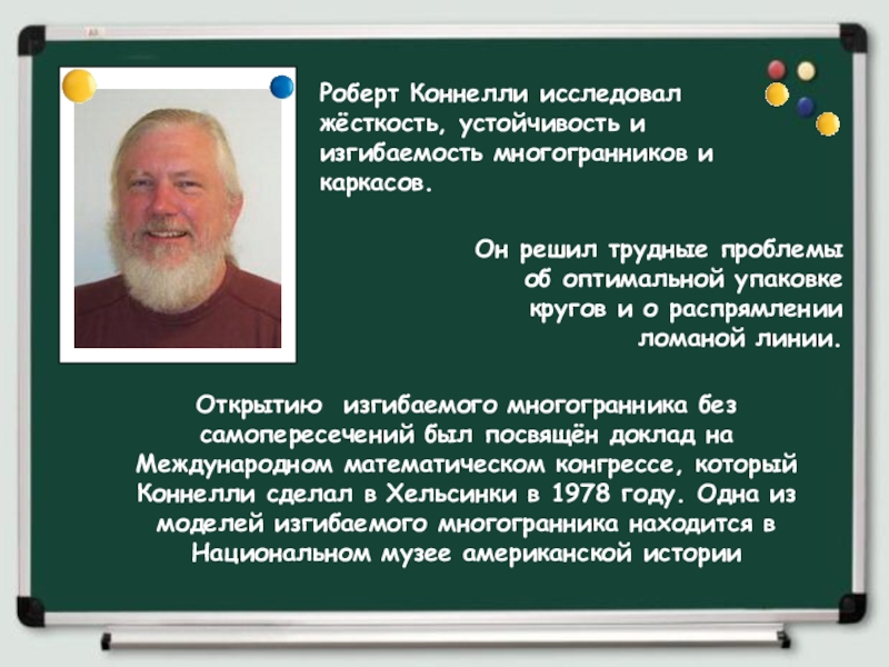 Открытию изгибаемого многогранника без самопересечений был посвящён доклад на Международном математическом конгрессе, который Коннелли сделал в Хельсинки в 1978 году. Одна из моделей изгибаемого многогранника находится в Национальном музее американской истории