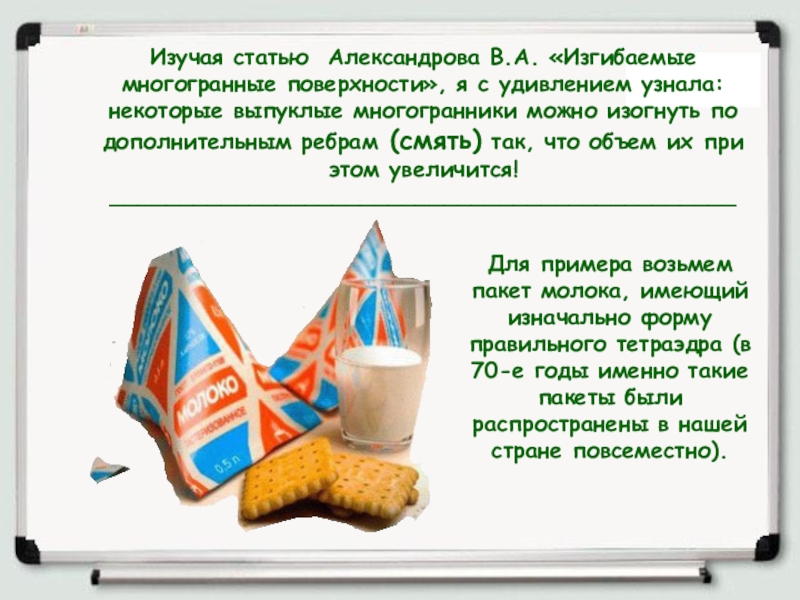 Для примера возьмем пакет молока, имеющий изначально форму правильного тетраэдра (в 70-е годы именно такие пакеты были распространены в нашей стране повсеместно).