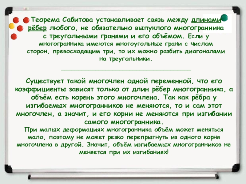 Существует такой многочлен одной переменной, что его коэффициенты зависят только от длин рёбер многогранника, а объём есть корень этого многочлена. Так как рёбра у изгибаемых многогранников не меняются, то и сам этот многочлен, а значит, и его корни не меняются при изгибании самого многогранника.