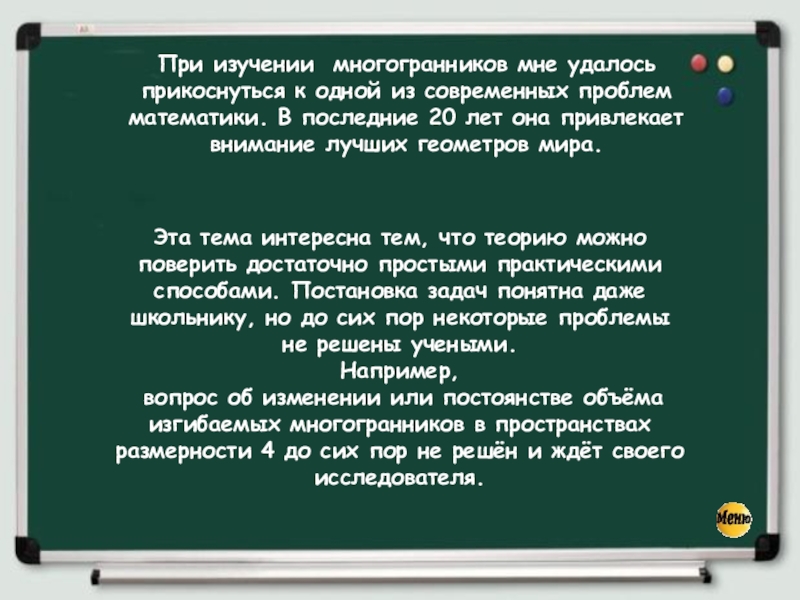 вопрос об изменении или постоянстве объёма изгибаемых многогранников в пространствах размерности 4 до сих пор не решён и ждёт своего исследователя.