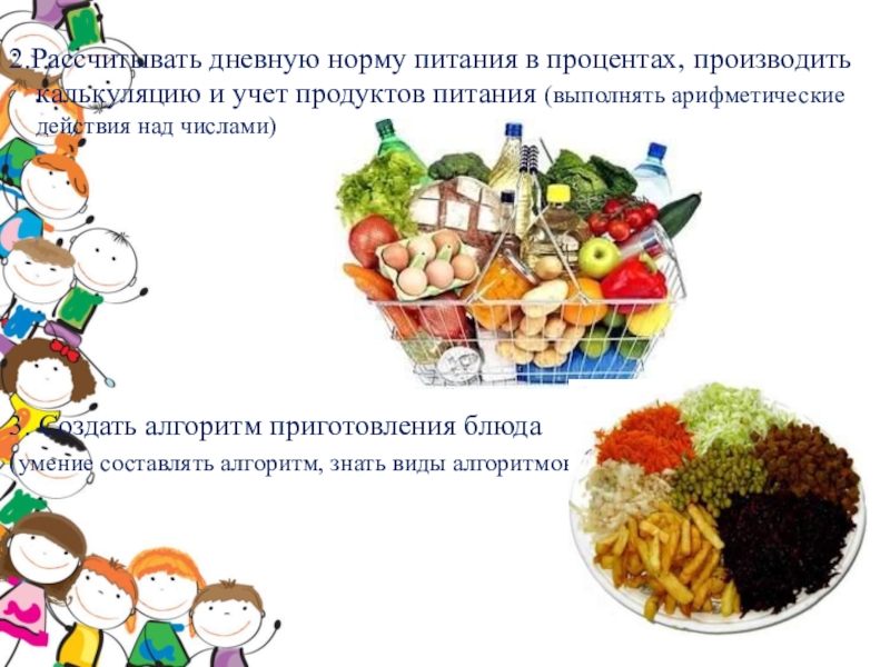 2.Рассчитывать дневную норму питания в процентах, производить калькуляцию и учет продуктов