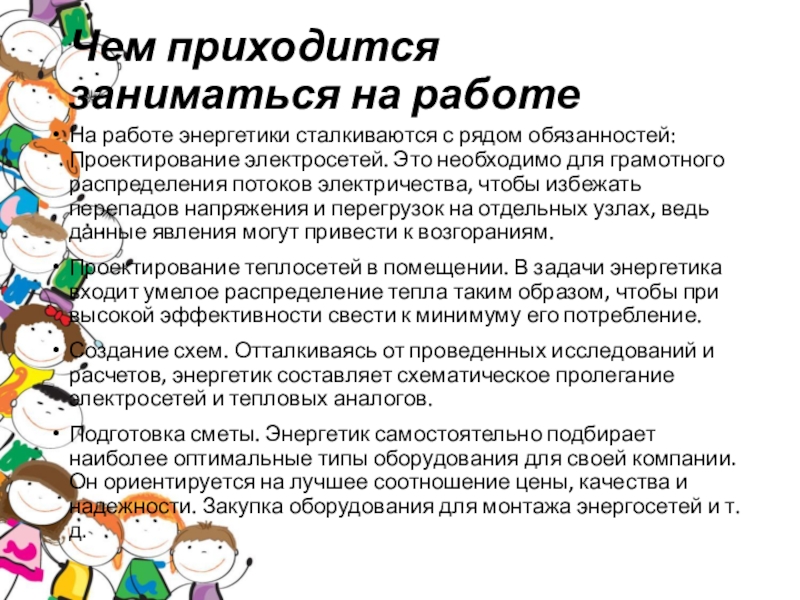 Слайд 20На работе энергетики сталкиваются с рядом обязанностей: Проектирование электросетей. Это необходимо