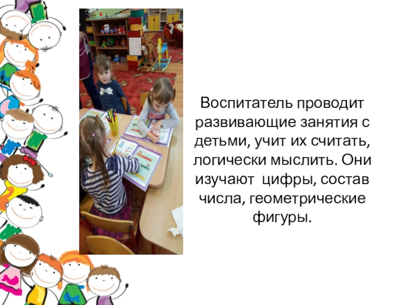 Слайд 12Воспитатель проводит развивающие занятия с детьми, учит их считать, логически мыслить.