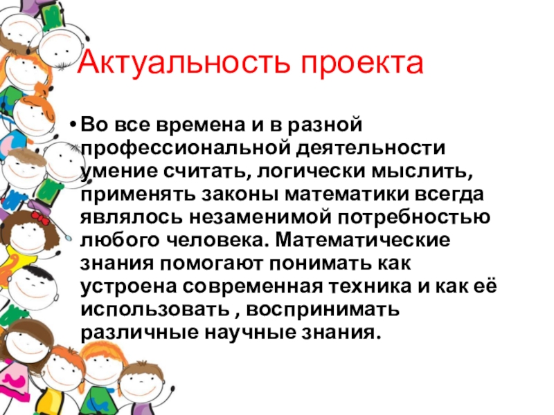 логически мыслить, применять законы математики всегда являлось незаменимой потребностью любого человека. Математические знания помогают понимать как устроена современная техника и как её использовать , воспринимать различные научные знания.