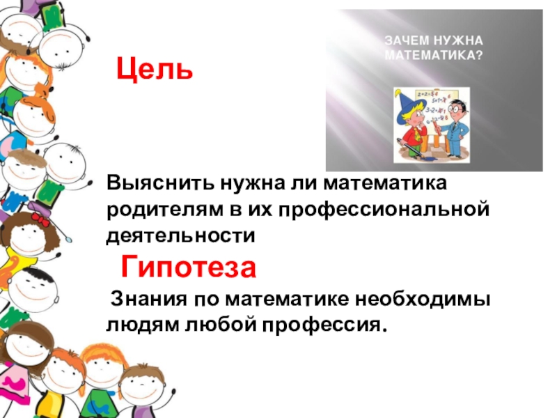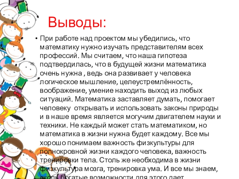 всех профессий. Мы считаем, что наша гипотеза подтвердилась, что в будущей жизни математика очень нужна , ведь она развивает у человека логическое мышление, целеустремлённость, воображение, умение находить выход из любых ситуаций. Математика заставляет думать, помогает человеку открывать и использовать законы природы и в наше время является могучим двигателем науки и техники. Не каждый может стать математиком, но математика в жизни нужна будет каждому. Все мы хорошо понимаем важность физкультуры для полнокровной жизни каждого человека, важность тренировки тела. Столь же необходима в жизни физкультура мозга, тренировка ума. И все мы знаем, сколь богатые возможности для этого дает математика!