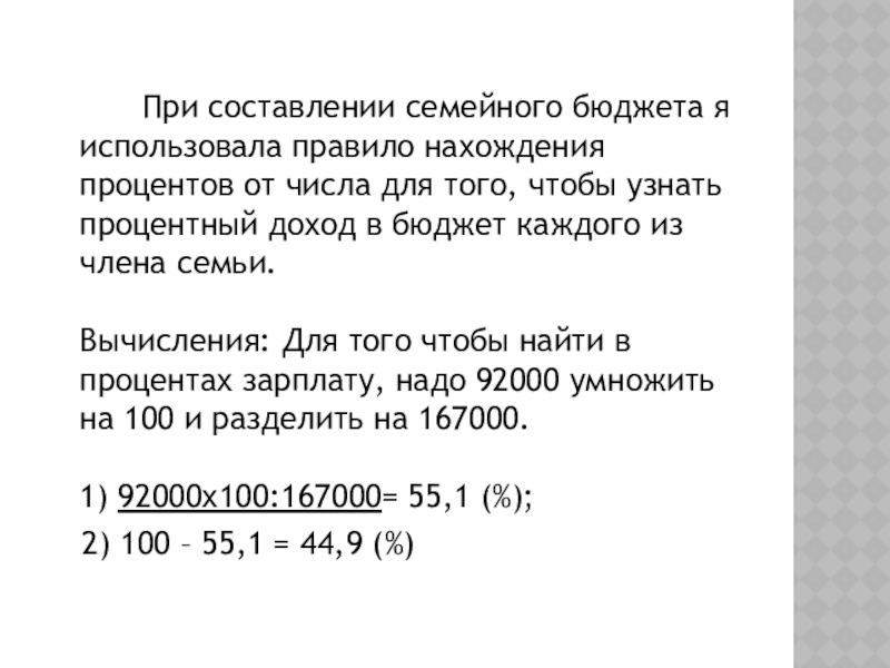 Слайд 18 При составлении семейного бюджета я использовала правило нахождения процентов от числа