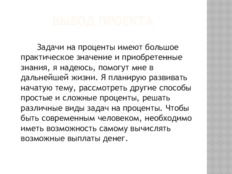 я надеюсь, помогут мне в дальнейшей жизни. Я планирую развивать начатую тему, рассмотреть другие способы простые и сложные проценты, решать различные виды задач на проценты. Чтобы быть современным человеком, необходимо иметь возможность самому вычислять возможные выплаты денег.