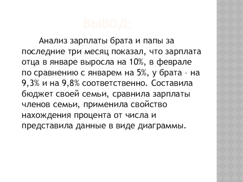 зарплата отца в январе выросла на 10%, в феврале по сравнению с январем на 5%, у брата – на 9,3% и на 9,8% соответственно. Составила бюджет своей семьи, сравнила зарплаты членов семьи, применила свойство нахождения процента от числа и представила данные в виде диаграммы.