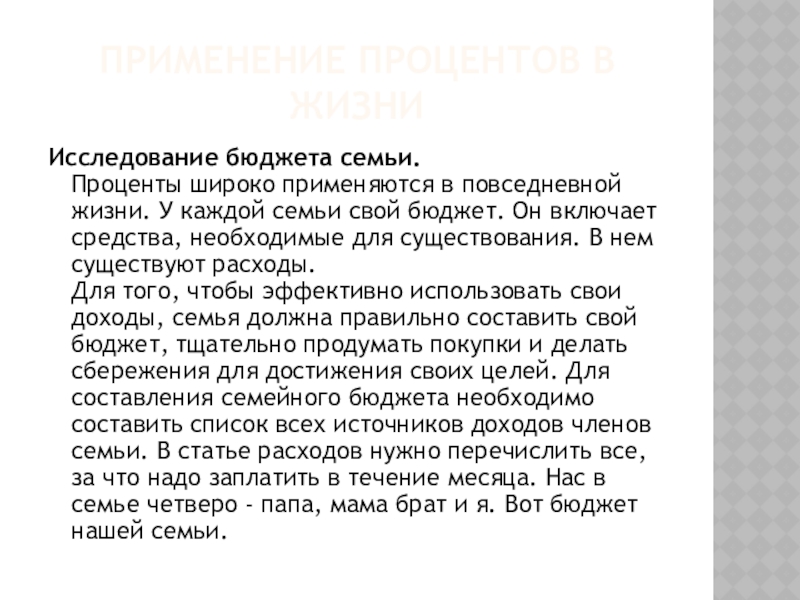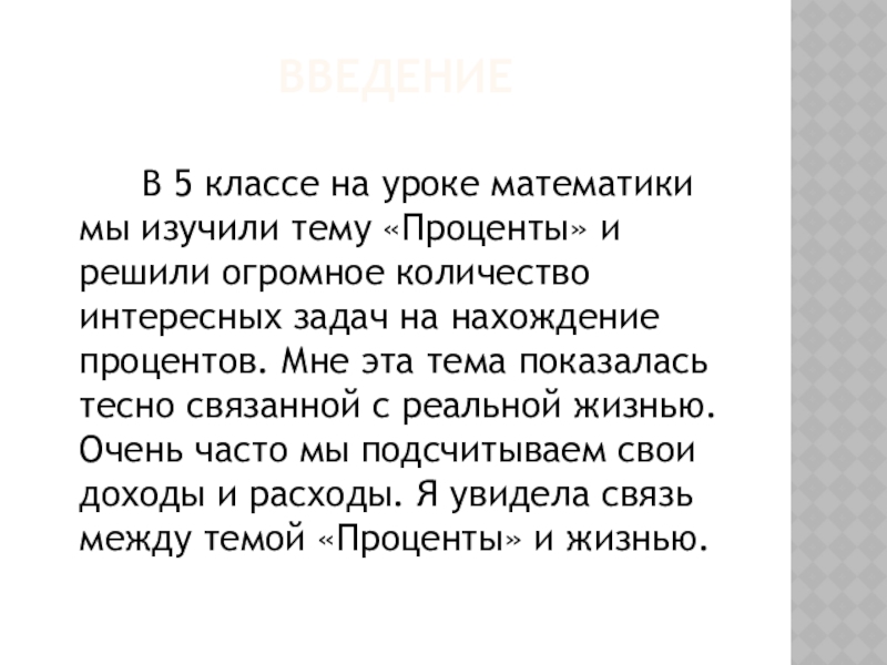решили огромное количество интересных задач на нахождение процентов. Мне эта тема показалась тесно связанной с реальной жизнью. Очень часто мы подсчитываем свои доходы и расходы. Я увидела связь между темой «Проценты» и жизнью.