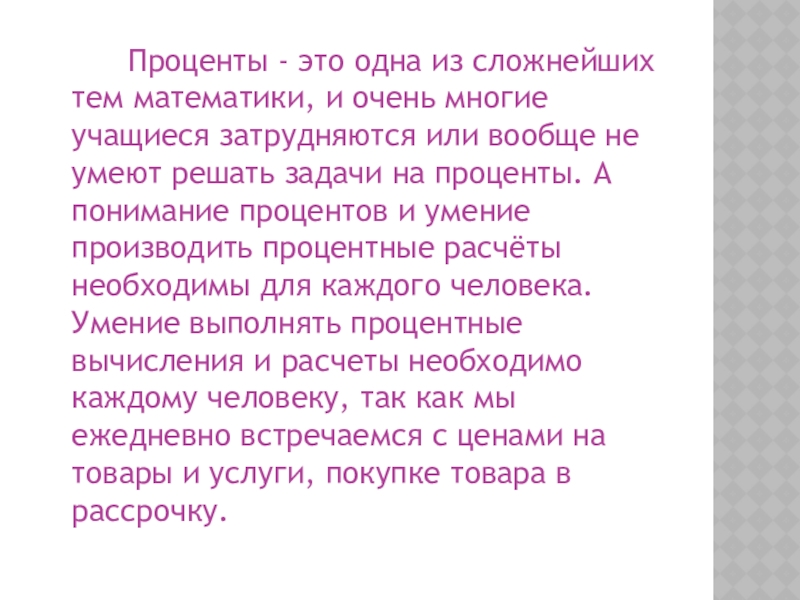 учащиеся затрудняются или вообще не умеют решать задачи на проценты. А понимание процентов и умение производить процентные расчёты необходимы для каждого человека. Умение выполнять процентные вычисления и расчеты необходимо каждому человеку, так как мы ежедневно встречаемся с ценами на товары и услуги, покупке товара в рассрочку.