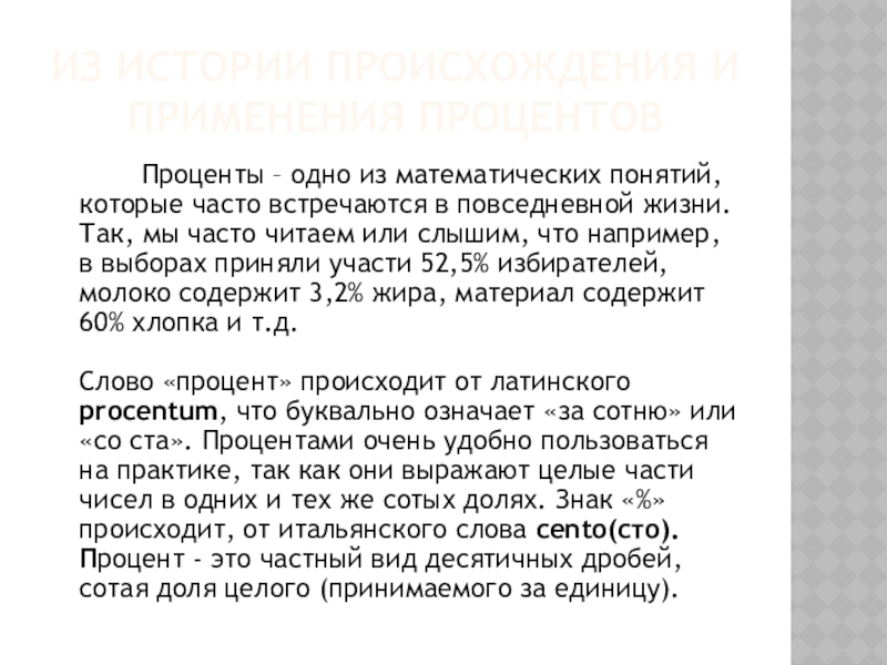 Слово «процент» происходит от латинского procentum, что буквально означает «за сотню» или «со ста». Процентами очень удобно пользоваться на практике, так как они выражают целые части чисел в одних и тех же сотых долях. Знак «%» происходит, от итальянского слова cento(сто). Процент - это частный вид десятичных дробей, сотая доля целого (принимаемого за единицу).