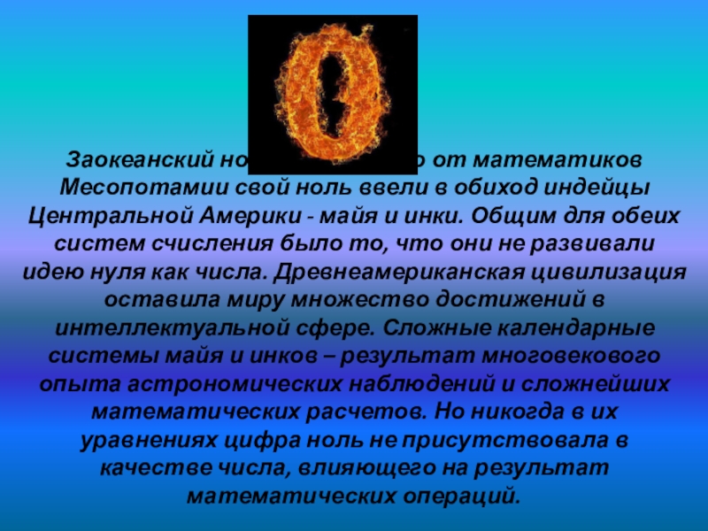 Слайд 4Заокеанский ноль Независимо от математиков Месопотамии свой ноль ввели в обиход