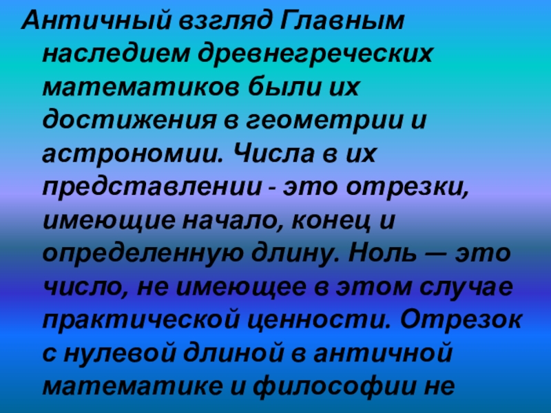 и астрономии. Числа в их представлении - это отрезки, имеющие начало, конец и определенную длину. Ноль — это число, не имеющее в этом случае практической ценности. Отрезок с нулевой длиной в античной математике и философии не имел смысла.