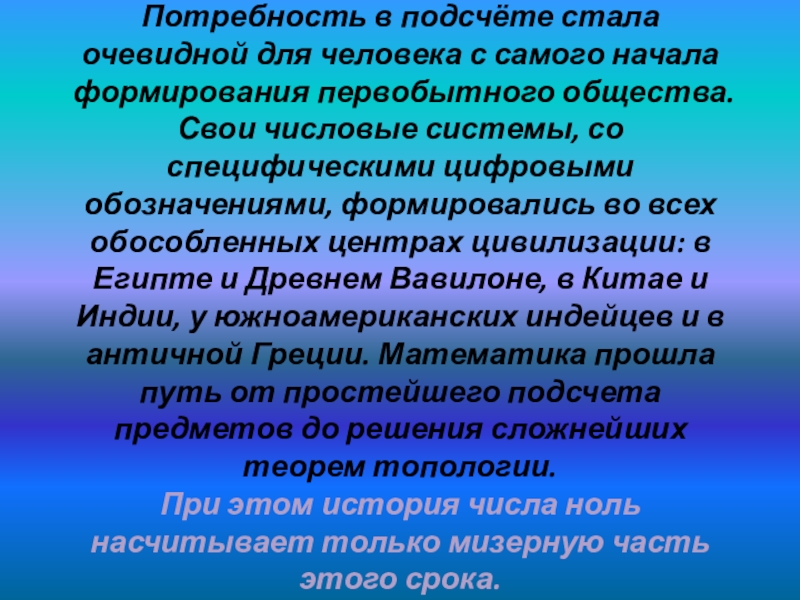 первобытного общества. Свои числовые системы, со специфическими цифровыми обозначениями, формировались во всех обособленных центрах цивилизации: в Египте и Древнем Вавилоне, в Китае и Индии, у южноамериканских индейцев и в античной Греции. Математика прошла путь от простейшего подсчета предметов до решения сложнейших теорем топологии. При этом история числа ноль насчитывает только мизерную часть этого срока.