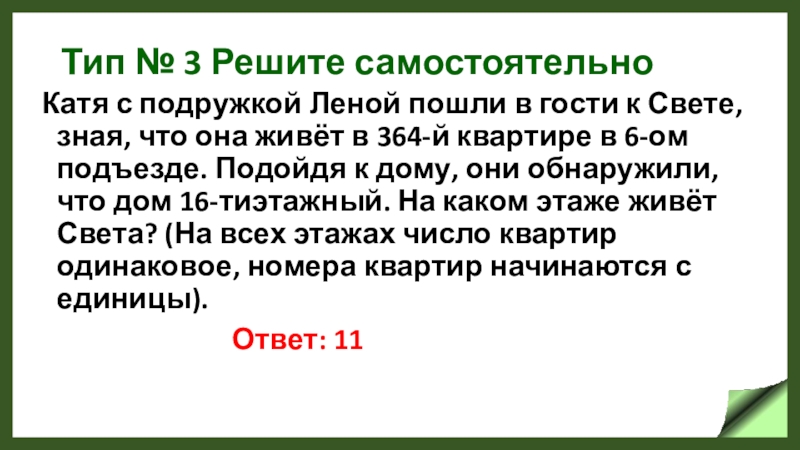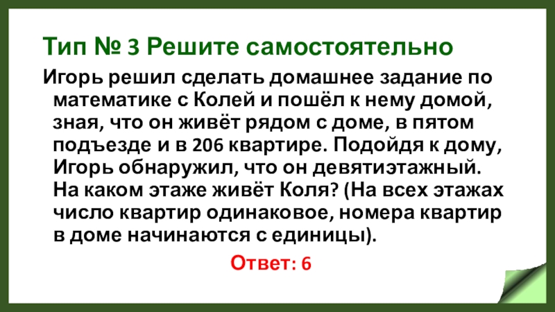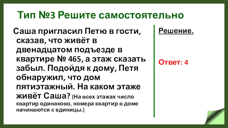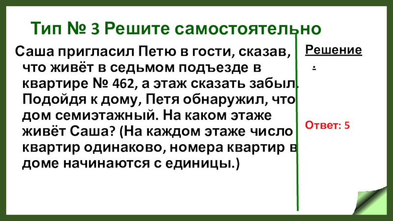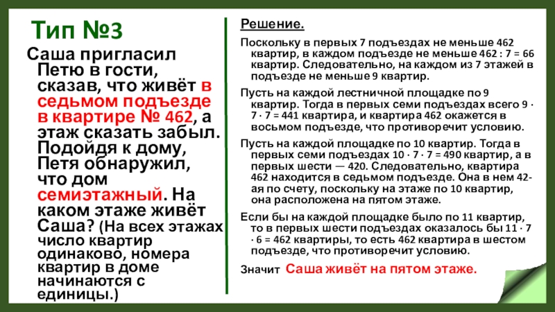 подъезде в квартире № 462, а этаж сказать забыл. Подойдя к дому, Петя обнаружил, что дом семиэтажный. На каком этаже живёт Саша? (На всех этажах число квартир одинаково, номера квартир в доме начинаются с единицы.)