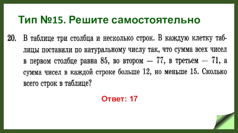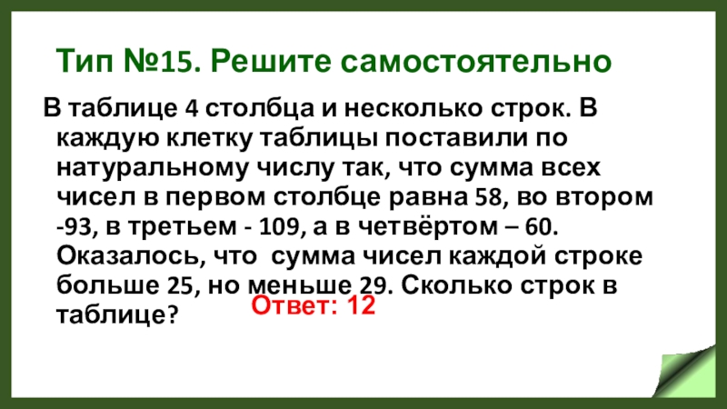 клетку таблицы поставили по натуральному числу так, что сумма всех чисел в первом столбце равна 119, во втором - 125, в третьем - 133, а сумма чисел в каждой строке больше 15, но меньше 18. Сколько всего строк в столбце?