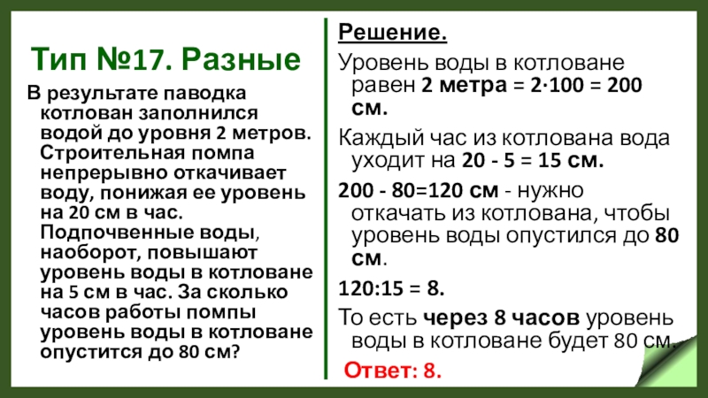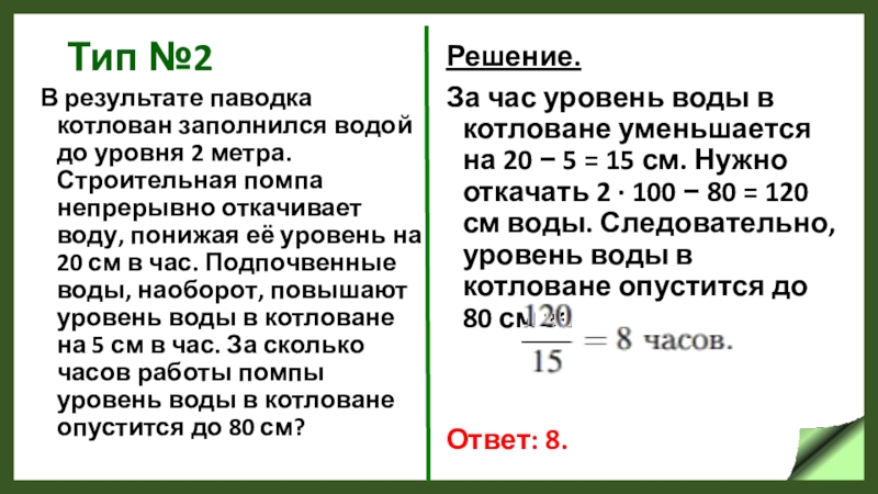 метров. Строительная помпа непрерывно откачивает воду, понижая ее уровень на 20 см в час. Подпочвенные воды, наоборот, повышают уровень воды в котловане на 5 см в час. За сколько часов работы помпы уровень воды в котловане опустится до 80 см?