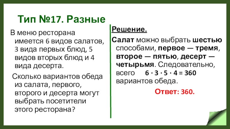 Салат можно выбрать шестью способами, первое — тремя, второе — пятью, десерт — четырьмя. Следовательно, всего 6 · 3 · 5 · 4 = 360 вариантов обеда.