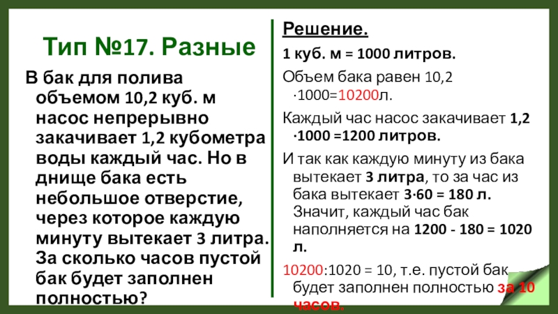 непрерывно закачивает 1,2 кубометра воды каждый час. Но в днище бака есть небольшое отверстие, через которое каждую минуту вытекает 3 литра. За сколько часов пустой бак будет заполнен полностью?